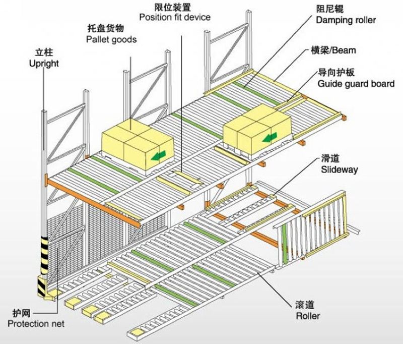 1、貨物由高的一端存入,滑至低端,從低端取出。貨物滑動過程中,滑道上(shàng)設置有(yǒu)阻(zǔ)尼器,控製貨物滑行速度保持在安全範圍內。滑(huá)道(dào)出貨一端設置有分離器(qì),搬運機械可順利取出第一板位置的貨物。