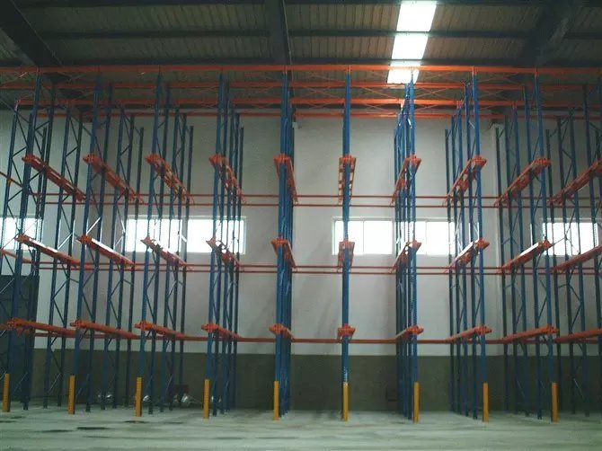 貫通式貨架又稱通廊式(shì)貨架(jià)或駛(shǐ)入式貨架(jià)。貫通式貨架可供叉車(或帶貨叉的無人搬運車(chē))駛入(rù)通道存取貨(huò)物,適用於品種少,批量(liàng)大(dà)類型的貨物儲存。貫通式(shì)貨架除了靠近通道的貨位,由於叉車需要進入貨架內部存取貨物,通常單麵取貨建議不超過7個貨位深度。為(wéi)提(tí)高叉(chā)車運行速度,可根據實際需要選擇配(pèi)置導向軌道,與貨位式貨架相(xiàng)比,貫(guàn)通式貨架(駛入(rù)式貨架)的庫空間利用率可提高30%以上,貫通式貨架(駛入式貨架)廣泛應用於批發(fā)、冷庫及食品、煙草行業。
